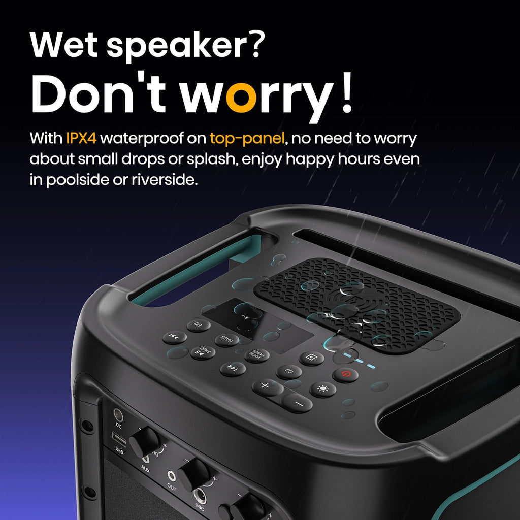 With IPX4 waterproof on top-panel, no need to worry about small drops or splash, enjoy happy hours even in poolside or riverside.