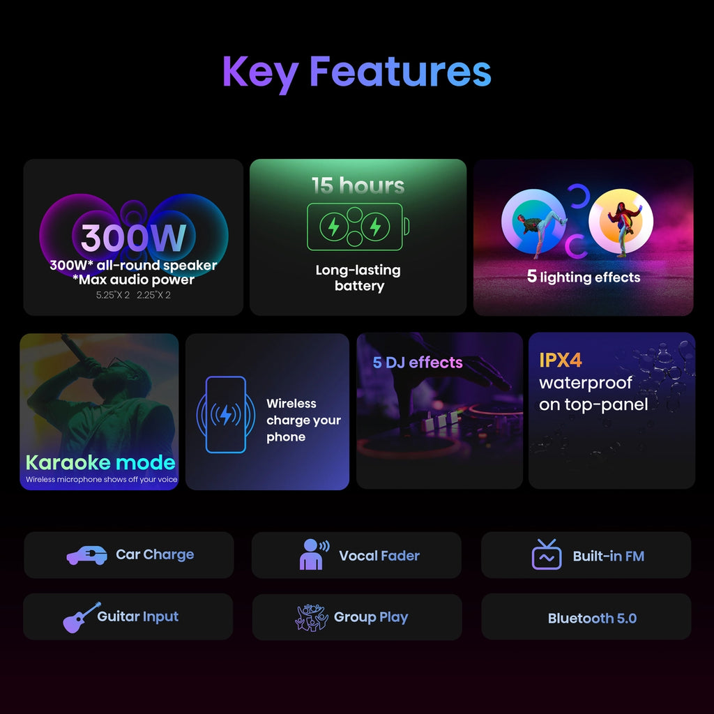 300W all-round speakers greatly amplify your entertainment with powerful, booming bass.